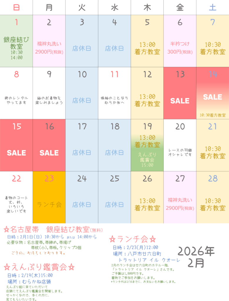 – 2/1(日) 名古屋帯・銀座結び教室(無料)